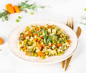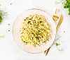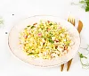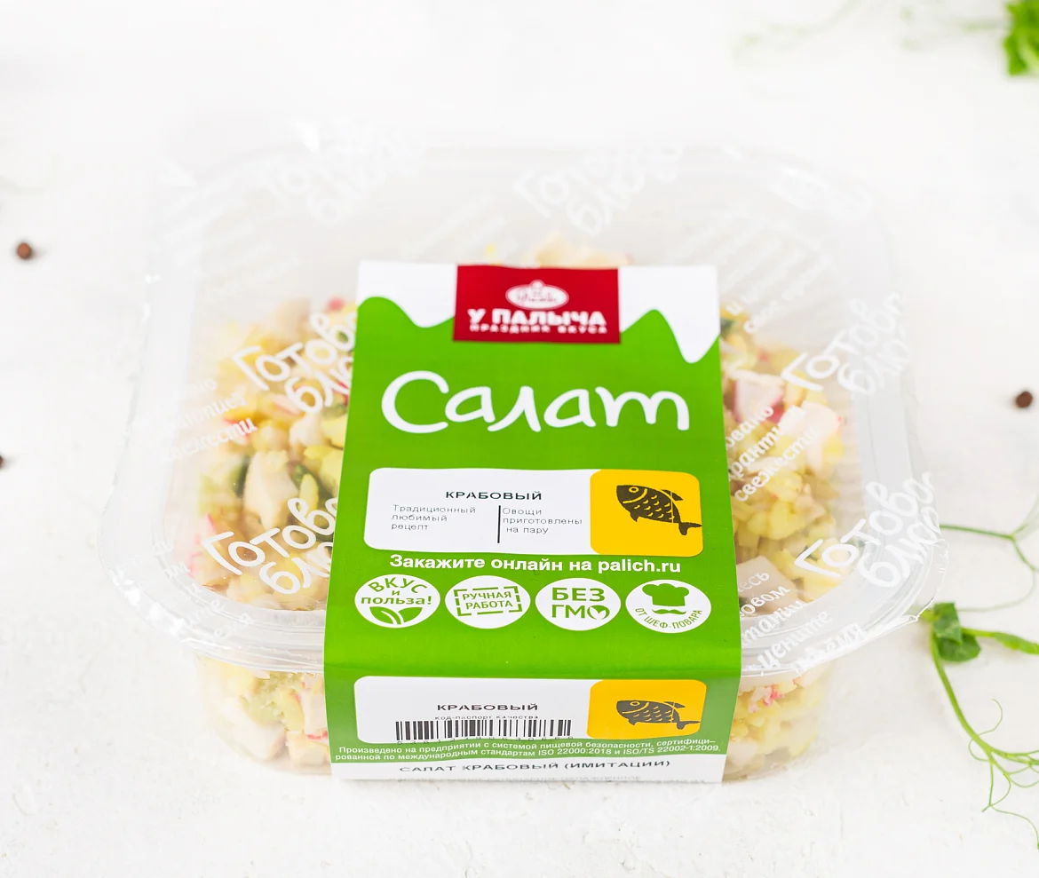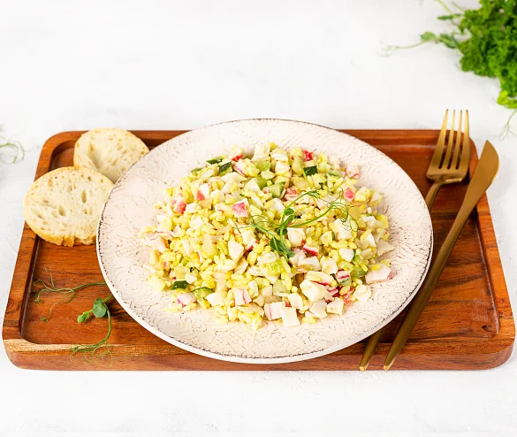 Традиционный салат, сочетающий сочность крабового мяса-имитации с свежестью огурцов и питательностью риса. В составе свежие вареные яйца, хрустящий репчатый лук и ароматная куркума, которая придаёт яркий цвет и вкус. Салат получается легким и насыщенным, идеально подходит для праздничного стола или как перекус. В салат уже добавлен вкуснейший майонез из натуральных ингредиентов от Палыча. Чтобы насладиться гармоничным вкусом, салат нужно перемешать.