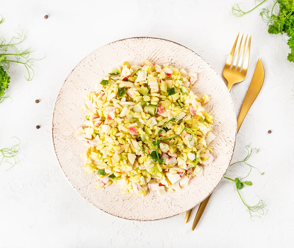Крабовое мясо имитация (фарш рыбный сурими из вида рыб: желтополосая сардинелла, тумбиль; из семейства рыб: нитеперые, влагоудерживающий агент полифосфаты, вода, крахмал пшеничный, масло растительное, крахмал картофельный, загуститель дикрахмалфосфат, соль, белок яичный, сахар, ароматизаторы, натуральные красители: кармины, экстракт паприки), кукуруза консервированная (кукуруза, вода, сахар, соль), яйцо куриное пищевое, огурцы свежие, вода очищенная, крупа рисовая, лук репчатый свежий, масло подсолнечное рафинированное, дезодорированное, соль, уксус столовый, сахар, сухой яичный желток, сухое обезжиренное молоко, нерафинированное горчичное масло, перец черный молотый, куркума молотая.