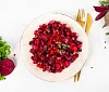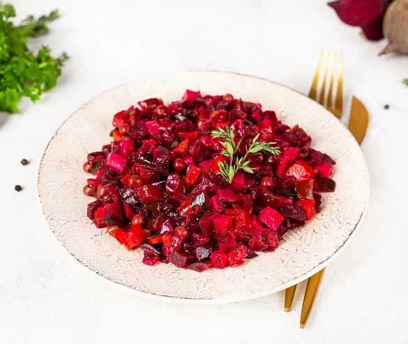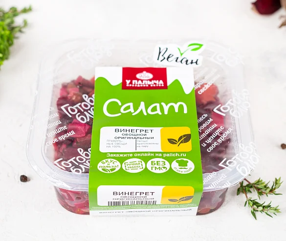 Огурцы маринованные (огурцы, вода, сахар, соль, регулятор кислотности уксусная кислота, зелень укропа, лук), свекла столовая свежая, картофель свежий, горошек зеленый консервированный (горошек зеленый, вода, соль, сахар), морковь столовая свежая, лук репчатый свежий, масло подсолнечное рафинированное дезодорированное.