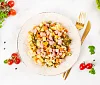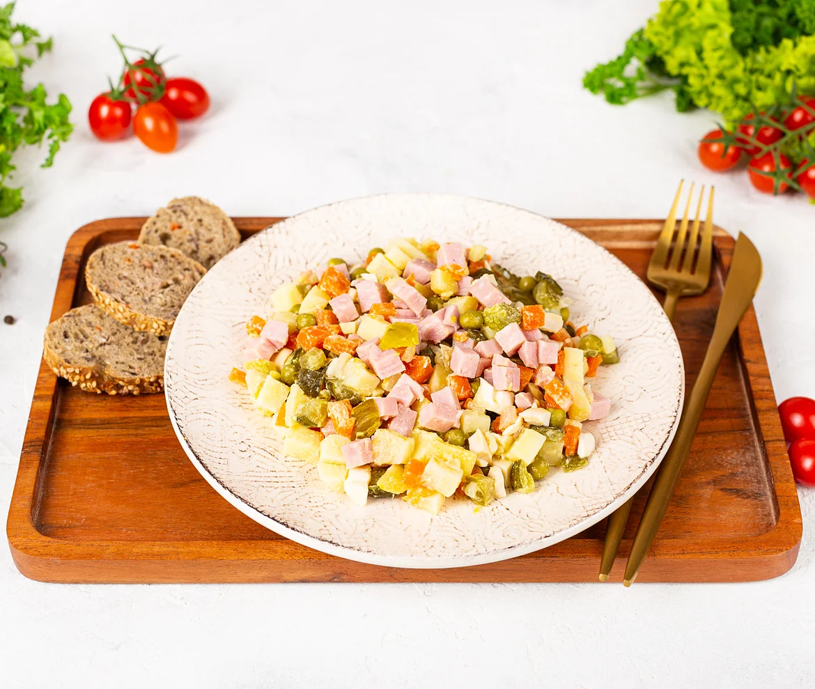 Огурцы маринованные (огурцы, вода, сахар, соль, регулятор кислотности уксусная кислота, зелень укропа, лук), картофель свежий, ветчина свиная (свинина, соль, мускатный орех, регуляторы кислотности трифосфат и пирофосфат натрия, нитритно-посолочная смесь (соль, фиксатор окраски нитрит натрия)), яйцо куриное пищевое, горошек зеленый консервированный (горошек зеленый, вода, соль, сахар), морковь столовая свежая, лук репчатый свежий, соль, уксус столовый, сахар, сухой яичный желток, сухое обезжиренное молоко, нерафинированное горчичное масло, перец черный молотый.