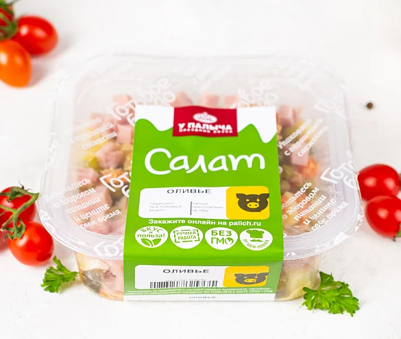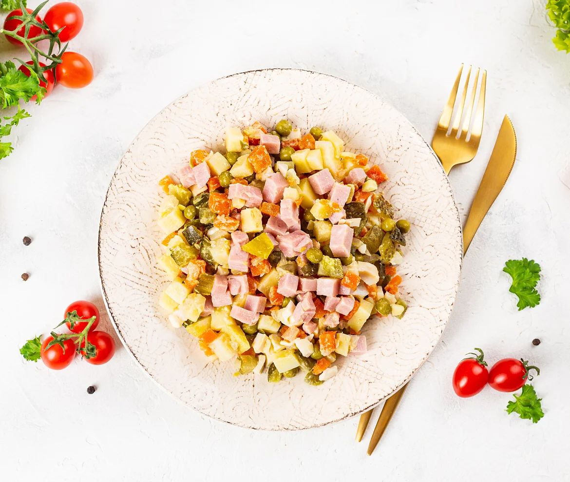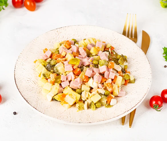 Классический салат, который сочетает в себе разнообразие текстур и вкусов. В основе вкуснейшая ветчина, маринованные огурчики, свежий картофель и сладкий зеленый горошек. Варёные яйца и морковь делают его более сытным и аппетитным. В салат уже добавлен вкуснейший майонез из натуральных ингредиентов от Палыча. Чтобы насладиться гармоничным вкусом, салат нужно перемешать.