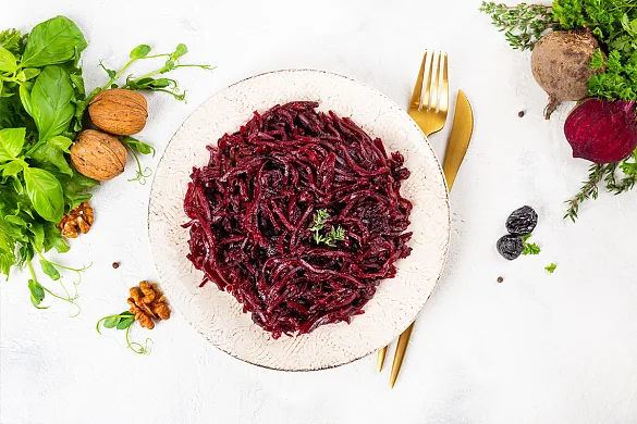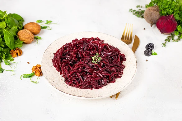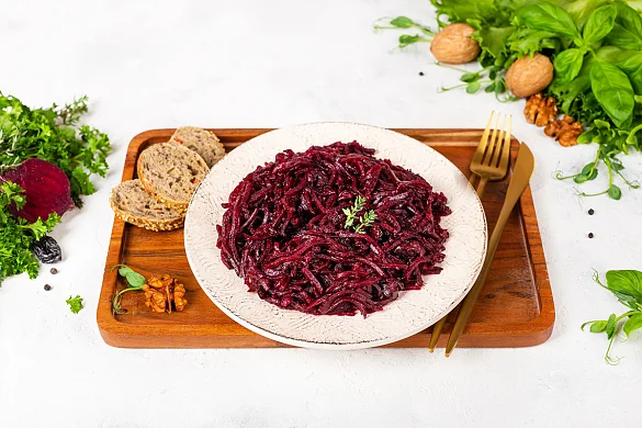 Полезный салат, в котором сочетаются сладость свеклы и мягкая кислинка вкуснейшего чернослива. Приготовленный с добавлением чеснока, он приобретает лёгкую остроту. Этот салат не только радует своим вкусом, но и насыщает организмы витаминами и минералами. В салат уже добавлен вкуснейший майонез из натуральных ингредиентов от Палыча. Чтобы насладиться гармоничным вкусом, салат нужно перемешать.