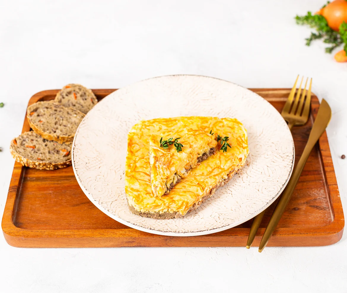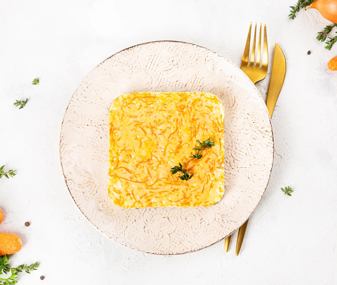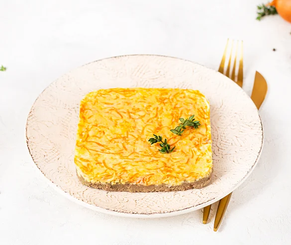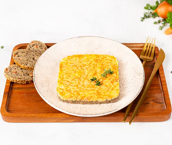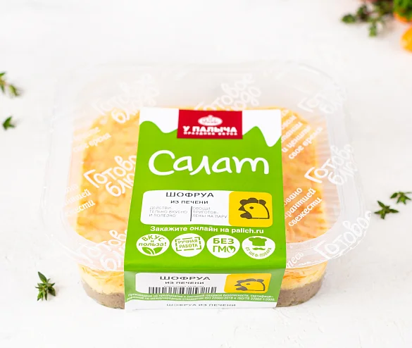 Субпродукты цыпленка-бройлера печень куриная, яйцо куриное пищевое, сыр Российский (молоко пастеризованное, закваска мезофильных и термофильных молочнокислых микроорганизмов, молокосвёртывающий ферментный препарат животного происхождения, соль, уплотнитель хлорид кальция), масло подсолнечное рафинированное дезодорированное, лук репчатый свежий, морковь столовая свежая, вода очищенная, масло сливочное (сливки пастеризованные), соль, уксус столовый, сахар, сухой яичный желток, сухое обезжиренное молоко, перец черный молотый, нерафинированное горчичное масло.
