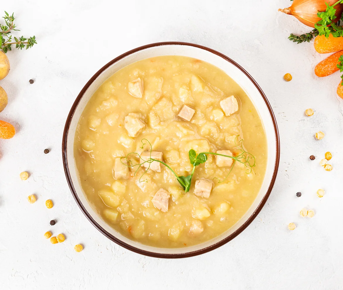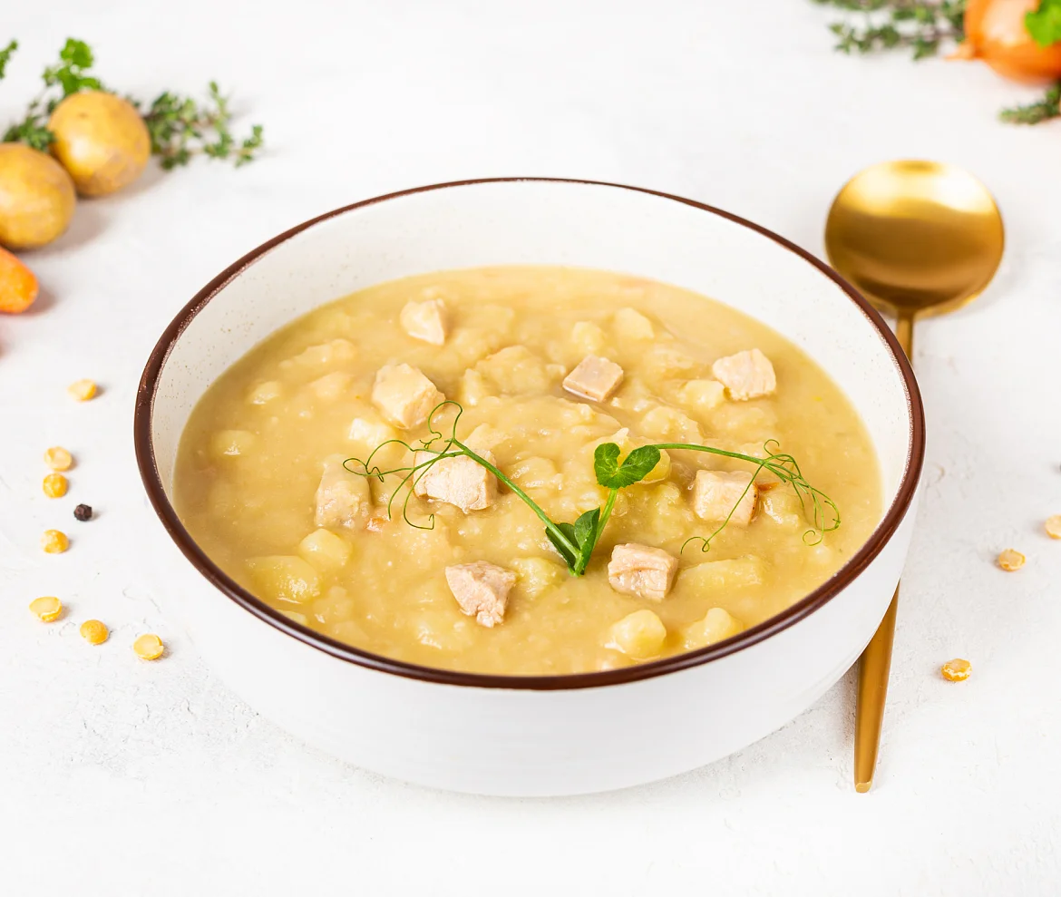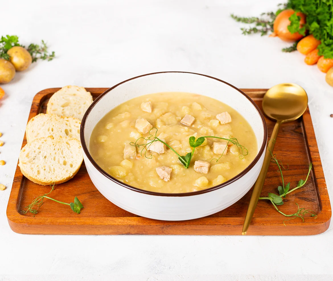 Бульон говяжий (вода очищенная, говядина, морковь столовая свежая, лук репчатый свежий), вода очищенная, горох желтый колотый, картофель свежий, рулет варено-копченый из мяса индейки (филе грудки индейки б/к, перец, нитритная соль), филе грудки цыплят-бройлеров б/к, бекон с/к (свинина, вода, нитритно-посолочная смесь (соль, фиксатор окраски нитрит натрия), регуляторы кислотности трифосфат и пирофосфат натрия, перец черный), лук репчатый свежий, морковь столовая свежая, масло подсолнечное рафинированное дезодорированное, соль, перец черный молотый, лавровый лист. Произведено на предприятии, на котором также выпускаются продукты, содержащие арахис, горчицу, глютен, кунжут, моллюски, молоко, орехи, рыбу, сельдерей, сою, яйца.