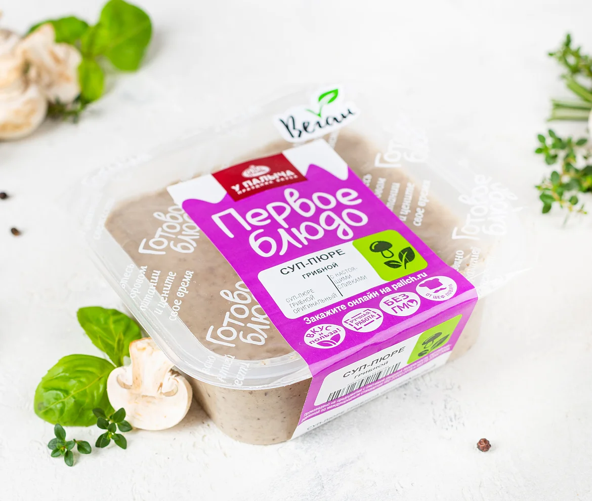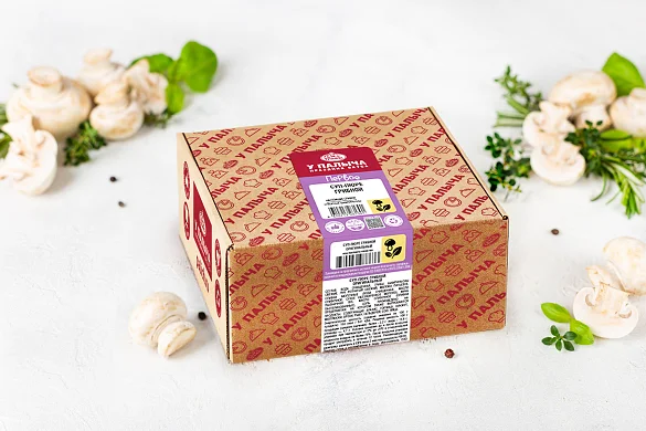 Вода очищенная, грибы шампиньоны свежие, лук репчатый свежий, молоко питьевое, сливки молочные (вода очищенная, масло сливочное, сухое обезжиренное молоко), мука пшеничная в/с, масло сливочное (сливки пастеризованные), соль. Произведено на предприятии, на котором также выпускаются продукты, содержащие арахис, горчицу, кунжут, моллюски, орехи, рыбу, сельдерей, сою, яйца.