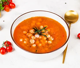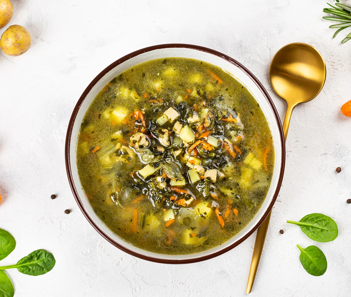 Вода очищенная, филе грудки и мясо окорочка цыплят-бройлеров б/к, картофель свежий, шпинат с/м, морковь столовая свежая, лук репчатый свежий, листья капусты пекинской свежие, лук зеленый свежий, соль, уксус столовый, зелень петрушки свежая, масло подсолнечное рафинированное дезодорированное, перец черный молотый. Произведено на предприятии, на котором также выпускаются продукты, содержащие арахис, горчицу, глютен, кунжут, моллюски, молоко, орехи, рыбу, сельдерей, сою, яйца.