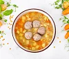 Низкокалорийный суп с полезной красной чечевицей, кубиками молодого картофеля и мясными шариками из отборной говядины и свиного окорока, приготовленный на легком курином бульоне, который идеально тонизирует иммунитет. Диетический согревающий суп богат полезной клетчаткой и легкоусвояемым белком — идеал для любого рациона.