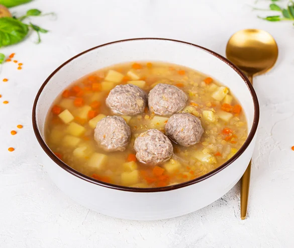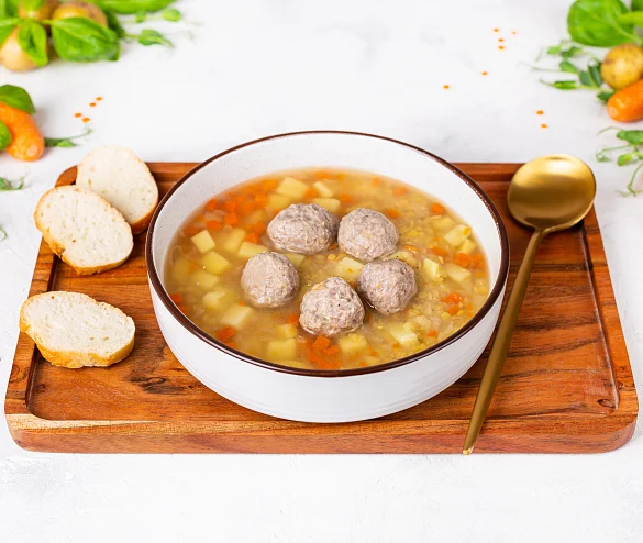 Низкокалорийный суп с полезной красной чечевицей, кубиками молодого картофеля и мясными шариками из отборной говядины и свиного окорока, приготовленный на легком курином бульоне, который идеально тонизирует иммунитет. Диетический согревающий суп богат полезной клетчаткой и легкоусвояемым белком — идеал для любого рациона.