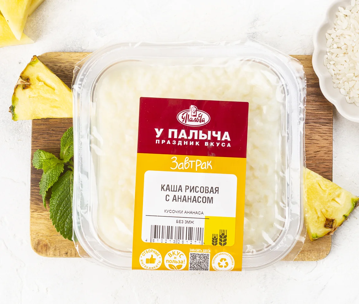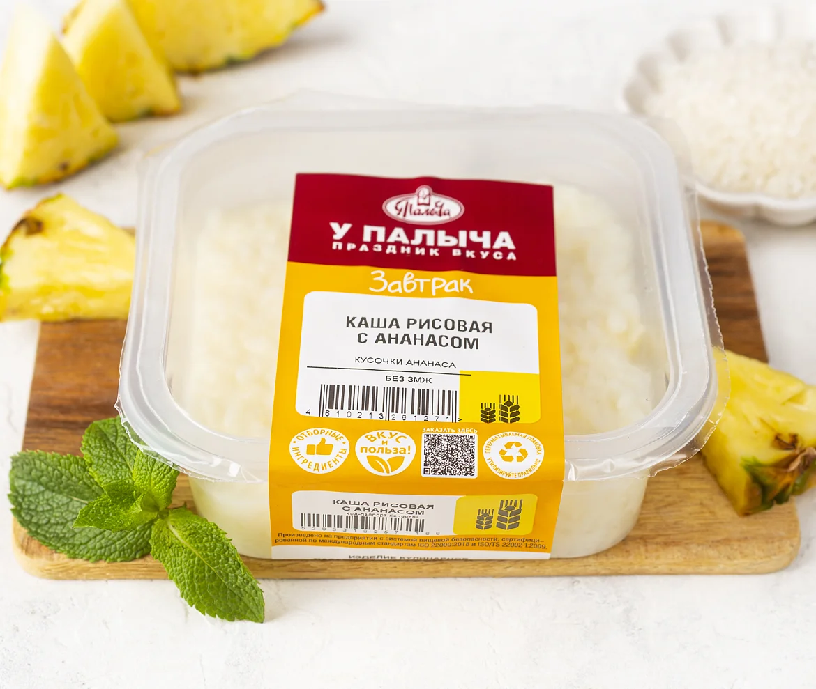 Молоко питьевое, вода очищенная, крупа рисовая, ананасы с/м, масло сливочное (сливки пастеризованные), сахар, соль. Произведено на предприятии, на котором также выпускаются продукты, содержащие арахис, горчицу, глютен, кунжут, моллюски, орехи, рыбу, сельдерей, сою, яйца.