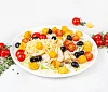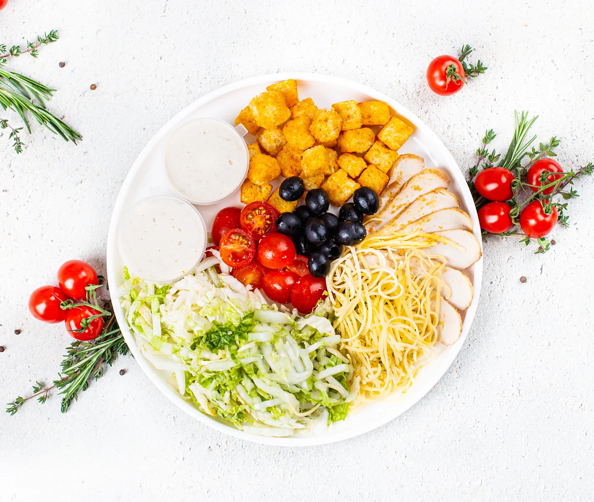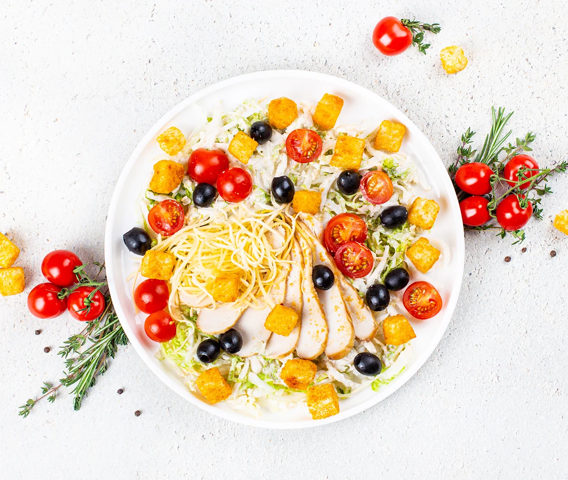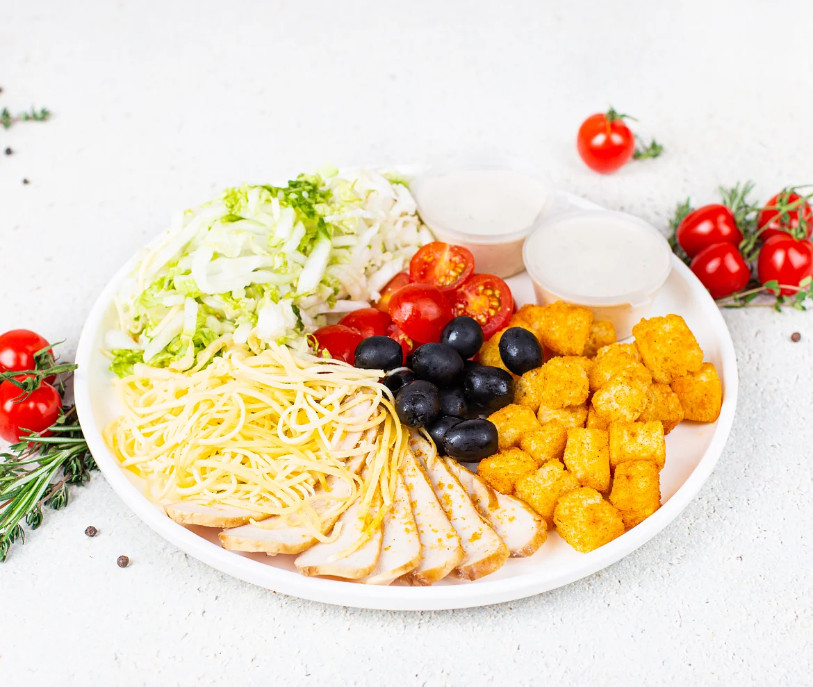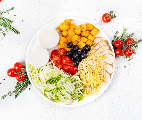 Листья капусты пекинской свежие, соус Цезарь (масло подсолнечное рафинированное дезодорированное, вода очищенная, сыр Пармезан (молоко цельное, молоко обезжиренное, соль, заквасочные термофильные культуры микробного происхождения, уплотнитель хлорид кальция), соус Уочестер (уксус солодовый (из ячменя), уксус, патока, сахар, соль, анчоусы, экстракт тамаринда, лук, чеснок, специи, ароматизаторы), горчица (вода питьевая, горчичный порошок, сахар, масло подсолнечное рафинированное дезодорированное, регулятор кислотности уксусная кислота, соль, перец черный, лавровый лист), уксус столовый, чеснок свежий, сахар, соль, сухой яичный желток, сухое обезжиренное молоко, загуститель ксантановая камедь, краситель каротины, нерафинированное горчичное масло), томаты свежие, филе грудки куриное б/к, гренки пшеничные (мука пшеничная хлебопекарная в/с, вода питьевая, сахар, масло подсолнечное рафинированное дезодорированное, чеснок свежий, соль, паприка сладкая молотая, дрожжи), сыр Пармезан (молоко цельное, молоко обезжиренное, соль, заквасочные термофильные культуры микробного происхождения, уплотнитель хлорид кальция), маслины черные б/к (маслины, вода питьевая, соль, фиксатор окраски глюконат железа), соевый соус (вода питьевая, соевые бобы, соль, пшеничная мука, сахар, краситель сахарный колер I простой), масло подсолнечное рафинированное дезодорированное, чеснок свежий.