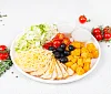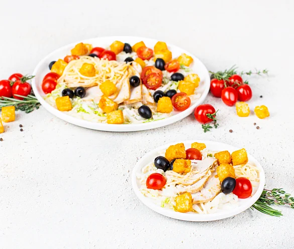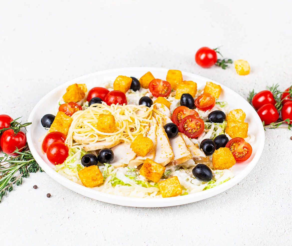 Знаменитое блюдо из свежих салатных листьев с аппетитными слайсами нежного куриного филе, ароматным сыром “Пармезан”, спелыми томатами, хрустящими пшеничными гренками и фирменной заправкой “Цезарь” с добавлением легендарного соуса “Вотчестер”, придающего салату оригинальность и особый шарм. Большая порция уже готова для праздничного стола!