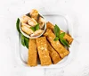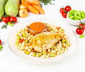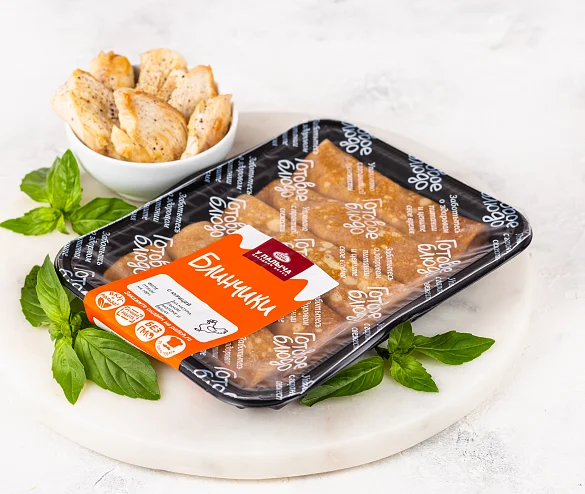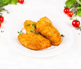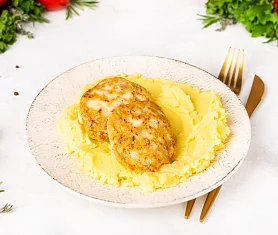 Филе грудки и мясо окорочка цыплят-бройлеров б/к, вода очищенная, мука пшеничная хлебопекарная в/с, лук репчатый свежий, молоко питьевое, яйцо куриное пищевое, масло сливочное (сливки пастеризованные), сахар, масло подсолнечное рафинированное дезодорированное, соль, зелень укропа свежая, перец черный молотый, перец белый молотый.