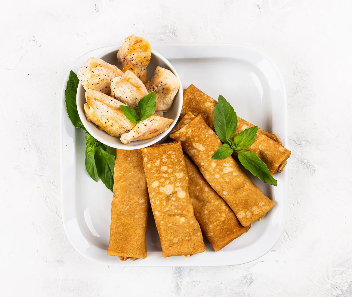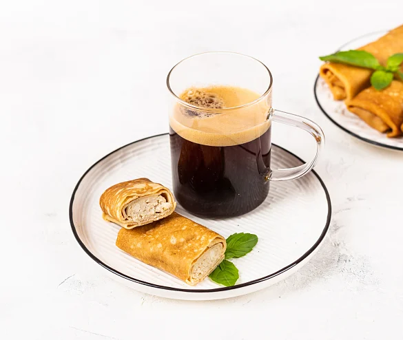 Тонкие блинчики для истинных гурманов, приготовлены по классическому рецепту на бездрожжевом тесте, без всяких добавок. В составе свежие деревенские яйца, отборное сливочное масло, молоко и пшеничная мука высшего сорта. Начинка только из свежих и натуральных ингредиентов: сочная начинка из курицы в соусе бешамель по классическому французскому и рецепту и обжаренный золотистый лук. Блинчики "У Палыча" - это ручная работа от мастеров блинного дела!