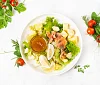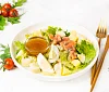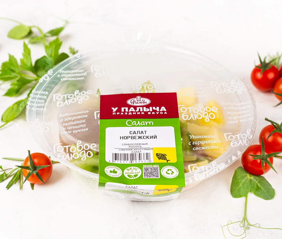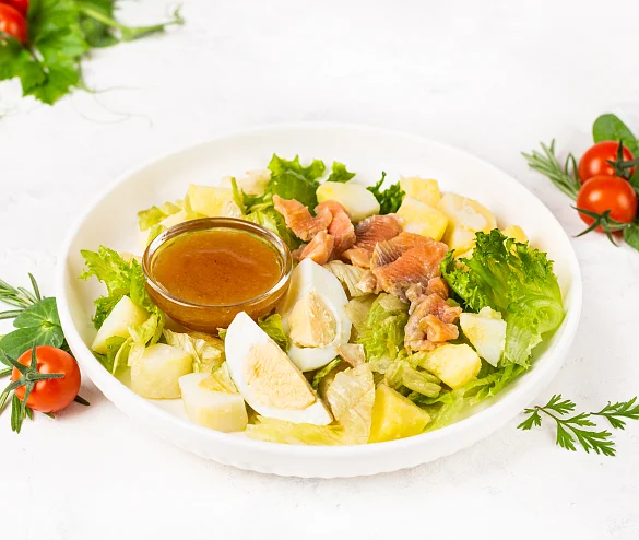Легкий, но питательный салат с нежной слабосоленой форелью, вареным яйцом, картошечкой и пикантными каперсами в окружении хрустящего свежего Айсберга и сочного Фриллиса.