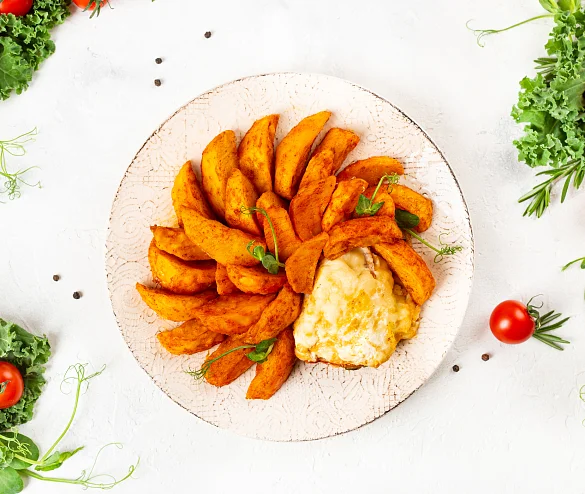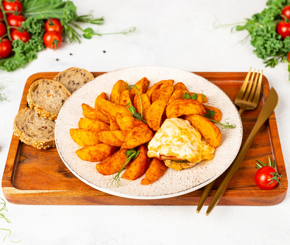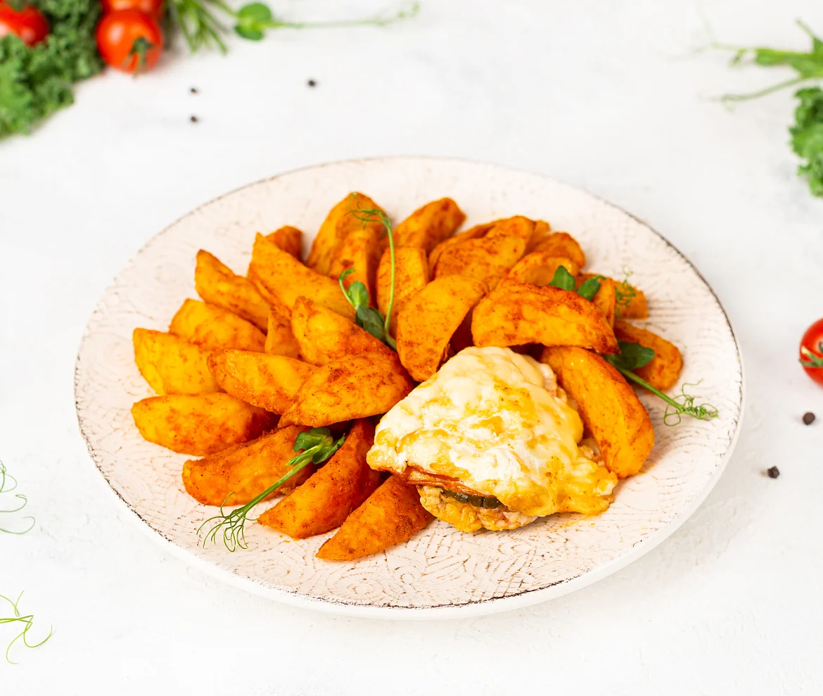 Картофель свежий, окорок свиной б/к, масло подсолнечное рафинированное дезодорированное, сыр Российский (молоко пастеризованное, закваска мезофильных и термофильных молочнокислых микроорганизмов, молокосвёртывающий ферментный препарат животного происхождения, соль, уплотнитель хлорид кальция), томаты свежие, лук репчатый свежий, огурцы маринованные (огурцы, вода, сахар, соль, регулятор кислотности уксусная кислота, зелень укропа, лук), кетчуп (томатная паста, сахар, вода очищенная, уксус столовый, соль, крахмал кукурузный), мука пшеничная в/с, вода очищенная, соль, паприка копченая молотая, паприка сладкая молотая, уксус столовый, сахар, сухой яичный желток, сухое обезжиренное молоко, перец черный молотый, нерафинированное горчичное масло. Произведено на предприятии, на котором также выпускаются продукты, содержащие арахис, кунжут, моллюски, орехи, рыбу, сельдерей, сою.