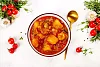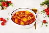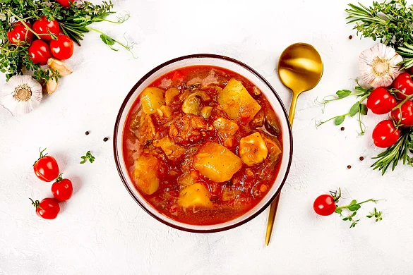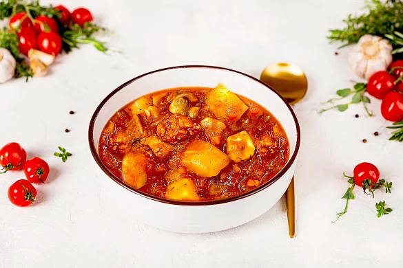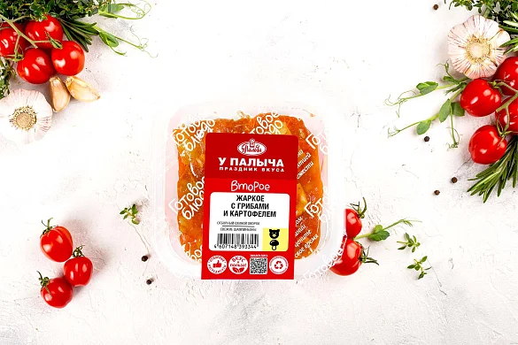 Отборная нежная свинина с вкуснейшими шампиньонами и рассыпчатой картошечкой, томленные в нежном томатном соусе с ароматными кавказскими специями.