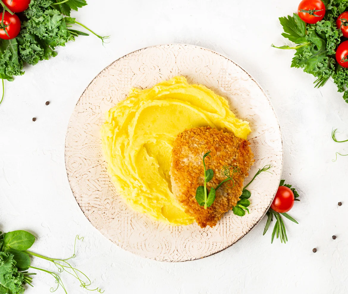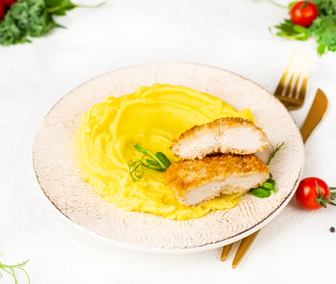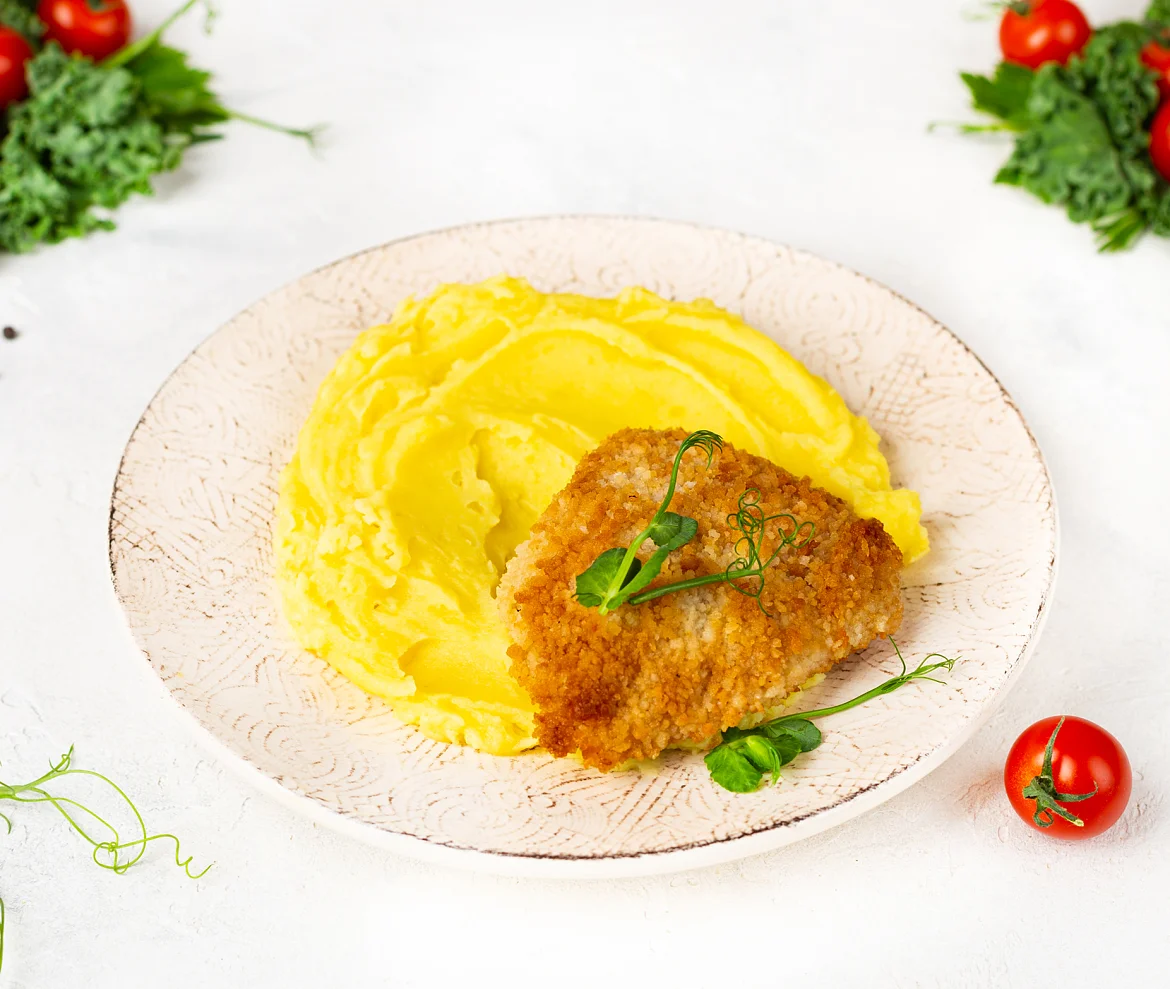 Классика европейской кухни - сочное, слегка отбитое, куриное филе в хрустящей панировке. В дополнение воздушное пюре из отборной картошечки. Удивительно вкусно!