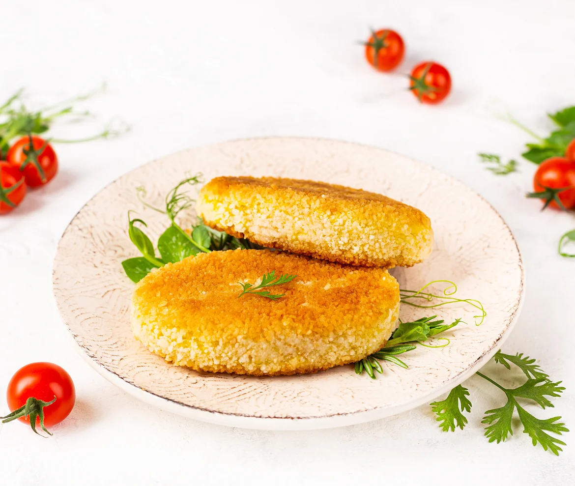 Картофель свежий, филе грудки и мясо окорочка цыплят-бройлеров б/к, грибы шампиньоны свежие, лук репчатый свежий, масло подсолнечное рафинированное дезодорированное, молоко питьевое, сухари панировочные (мука пшеничная хлебопекарная в/с, вода питьевая, сахар, масло подсолнечное, соль, дрожжи хлебопекарные), вода очищенная, крахмал кукурузный, мука пшеничная в/с, соль, масло сливочное (сливки пастеризованные), перец черный молотый, перец белый молотый.