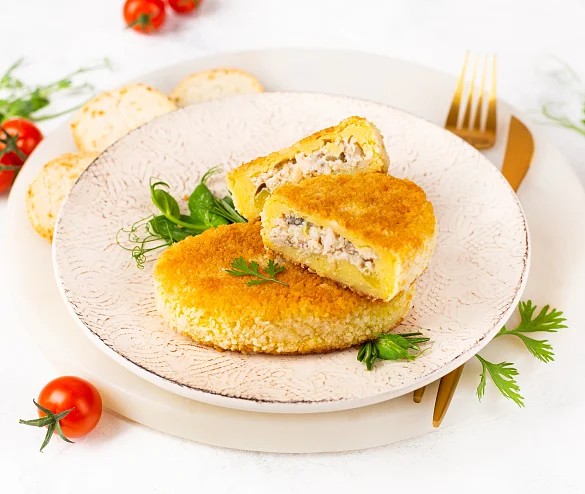 Вкусно, как в детстве. Зразы из воздушного картофельного пюре с сочной начинкой из куриного фарша. Только самая вкусная картошка особого сорта и только отборное филе цыпленка. Хрустящая корочка - отдельное удовольствие.