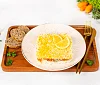 Яйцо куриное пищевое, филе кеты тихоокеанской б/к, морковь столовая свежая, сыр Российский (молоко пастеризованное, закваска мезофильных и термофильных молочнокислых микроорганизмов, молокосвёртывающий ферментный препарат животного происхождения, соль, уплотнитель хлорид кальция), масло подсолнечное рафинированное дезодорированное, вода очищенная, уксус столовый, сахар, сухое обезжиренное молоко, соль, сухой яичный желток, нерафинированное горчичное масло. Произведено на предприятии, на котором также выпускаются продукты, содержащие арахис, глютен, кунжут, моллюски, орехи, сельдерей, сою. Мы вручную убираем все косточки из рыбы, не используя химические растворители для костей, поэтому в продукте может остаться небольшое количество рыбьих косточек. Будьте аккуратны при употреблении рыбных блюд!