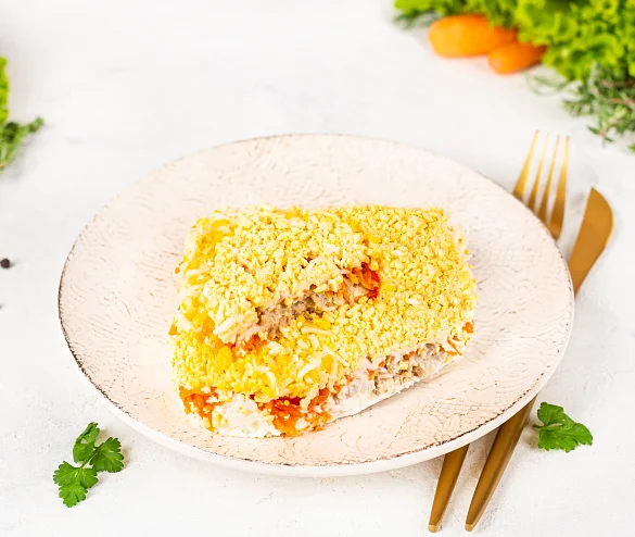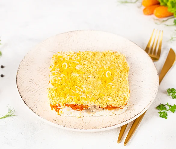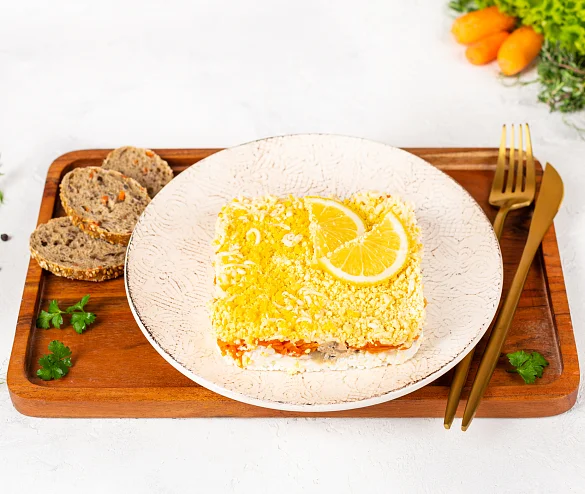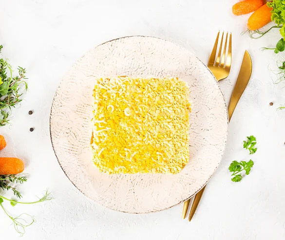 Любимый салат с пониженным содержанием калорий. Чтобы чаще радовать себя и своих близких вкуснейшим салатом, не беспокоясь о стройности, мы изменили традиционную рецептуру. Наша Мимоза менее калорийна по сравнению с классической, поскольку в ней нет сливочного масла. Только свежие ингредиенты, майонез собственного производства, нежная рыба - секрет потрясающего вкуса слоеного салата по рецепту нашего шеф-повара.