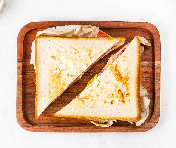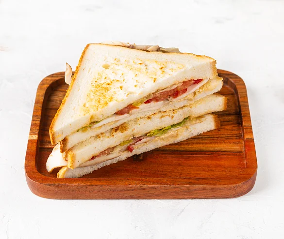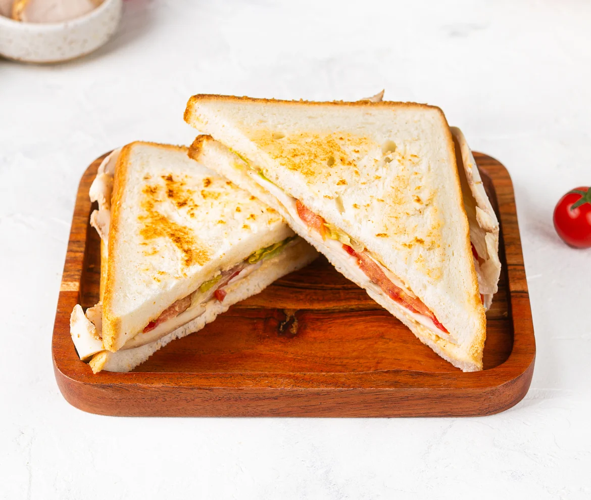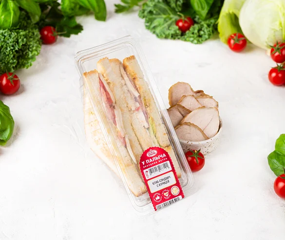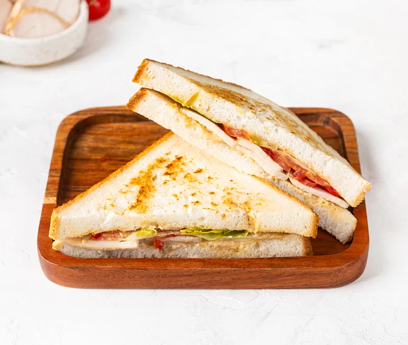 Аппетитный и сытный клаб-сэндвич на поджаренном воздушном хлебе с щедрой начинкой из куриного филе, спелых томатов, хрустящих листьев салата Айсберг, ароматного Пармезана и нежного соуса.