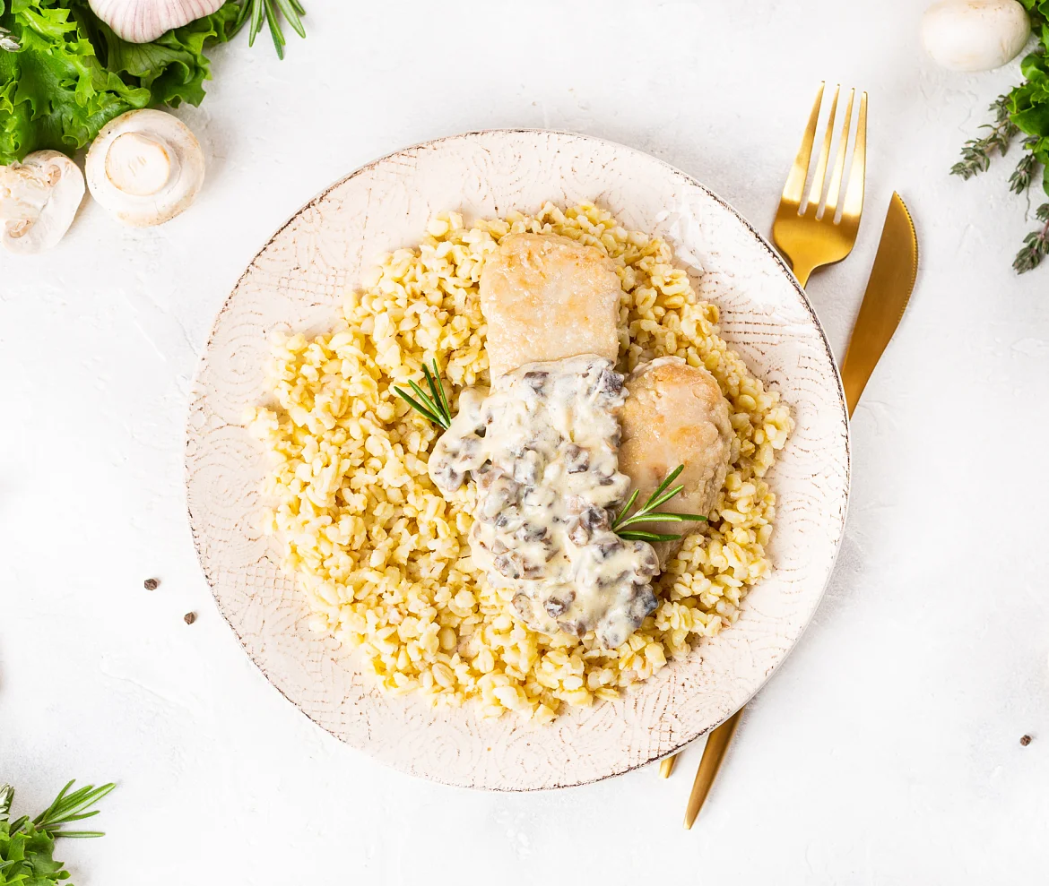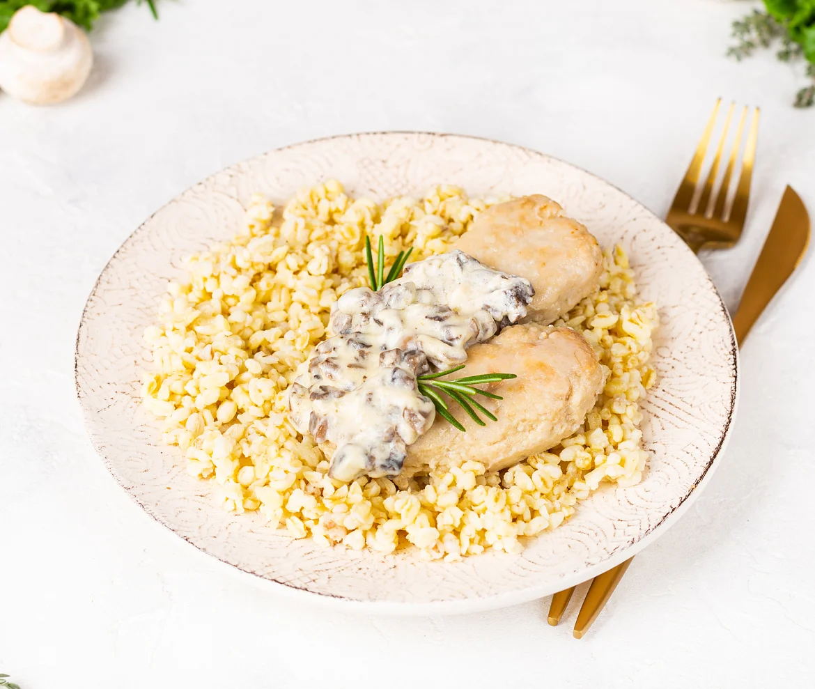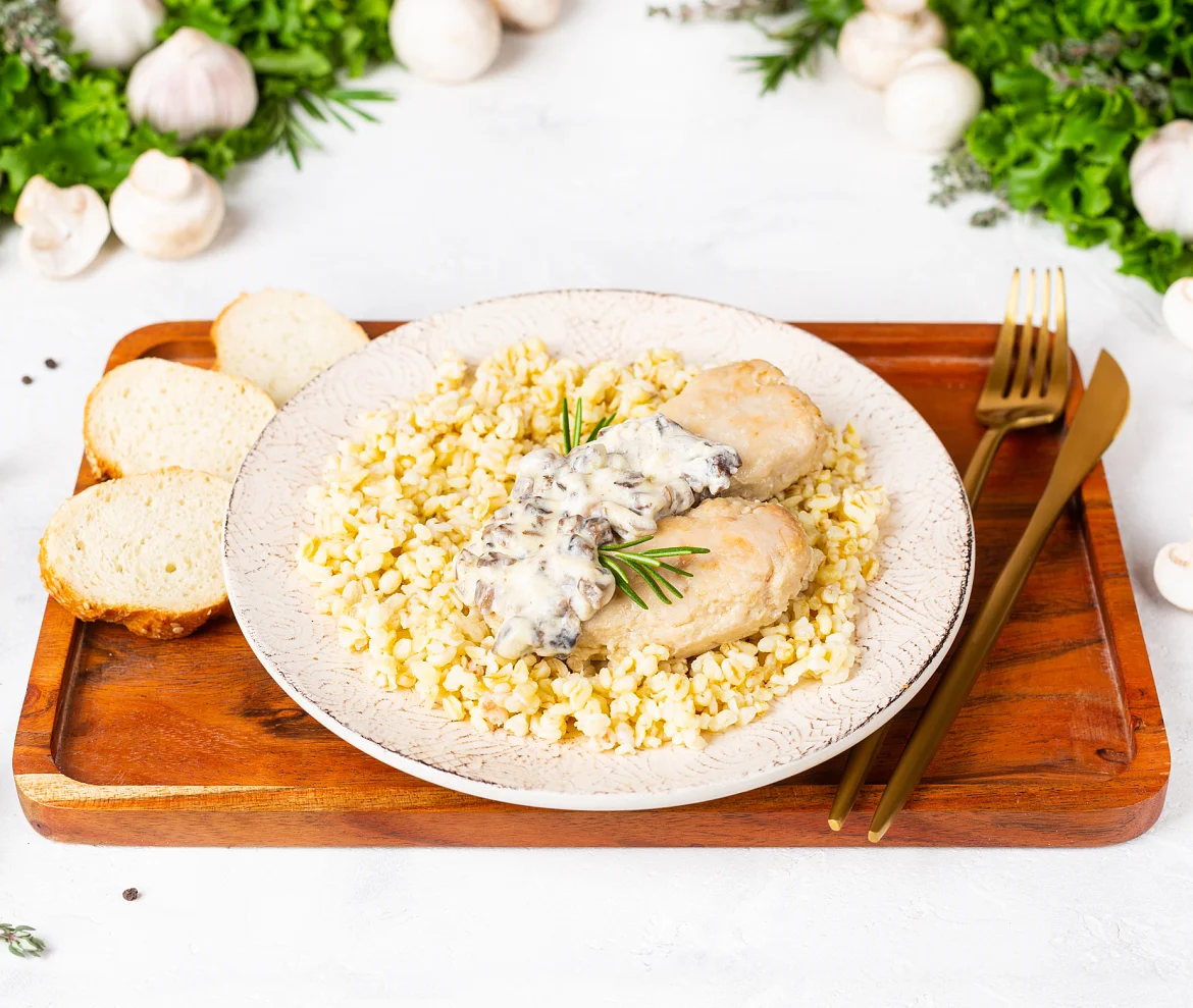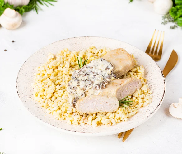 Нежные котлетки из отборного куриного филе с гарниром из полезного и вкусного булгура и вкуснейшим грибным соусом по рецепту от нашего шефа.