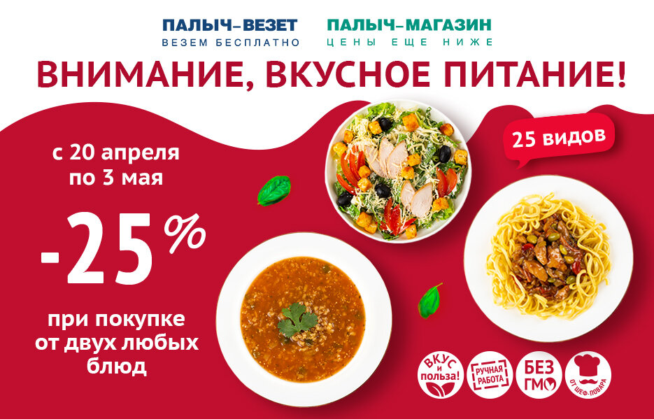 Выгода 25 % в Палыч- Везёт и Палыч-Магазин при покупке от двух блюд!